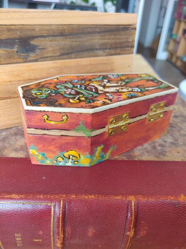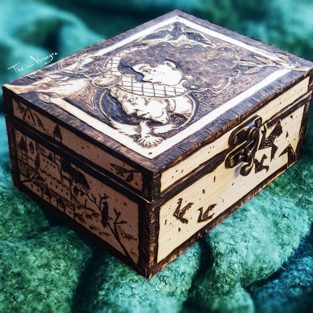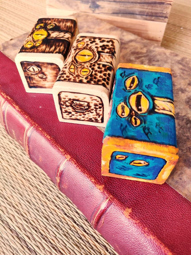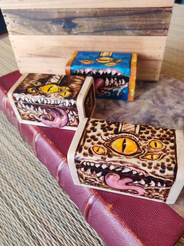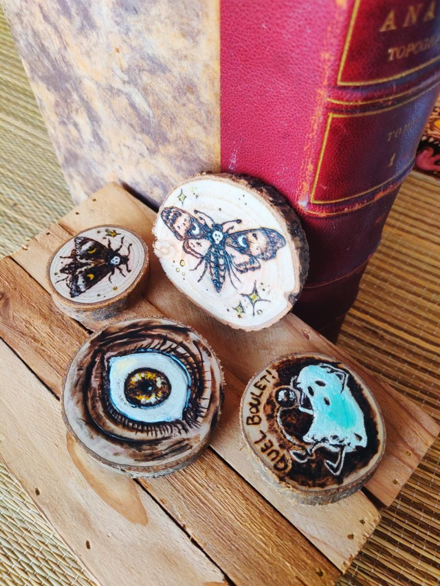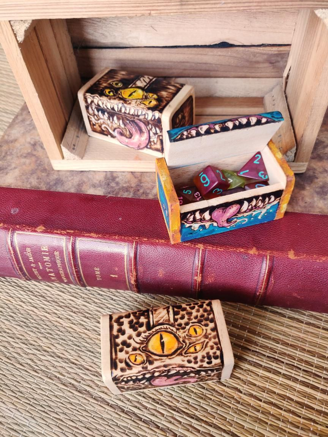 Fantôme, zombie, mimic, sphinx tête de mort... chaque pièce est unique, pyrogravée et peinte à la main, puis revêtue de vernis mat, et enfin, signée !